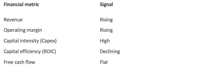 If capital intensity keeps rising, incremental returns decline, even if operating margins look strong.